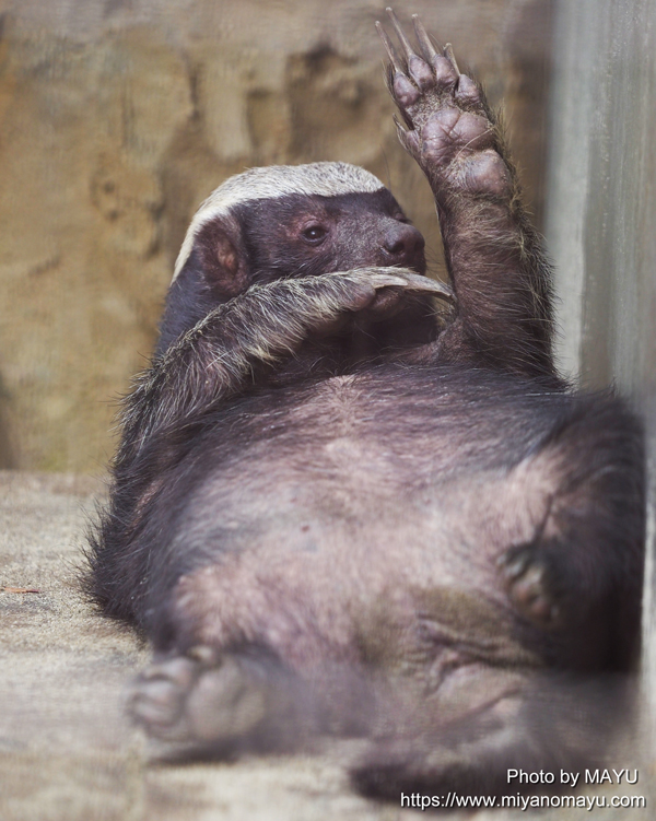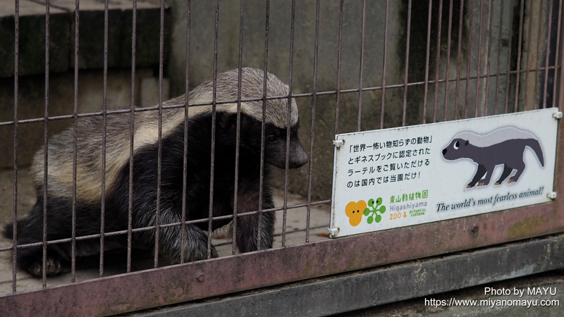 獣舎の一角に設置している看板には、「世界一怖いもの知らずの動物」とギネスブックに認定された動物と紹介されています。ギネスにはいろいろな枠がありますね。ラーテルは性質が荒いそうで、特に繁殖期などは気性が荒く、大型猛獣でも立ち向かったり、何でも食べようとする貪欲さなどから、そう呼ばれているそうです。