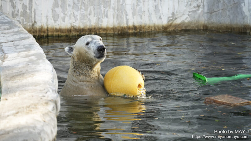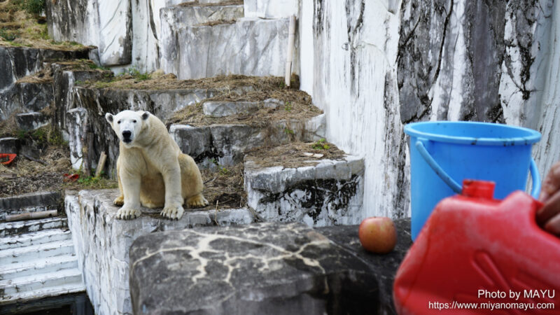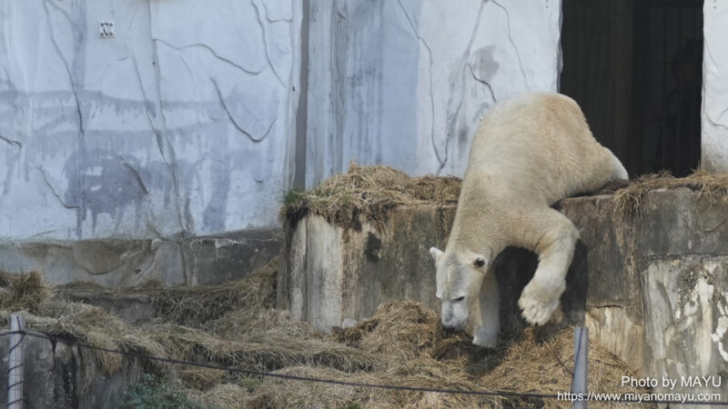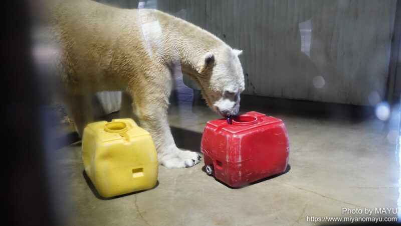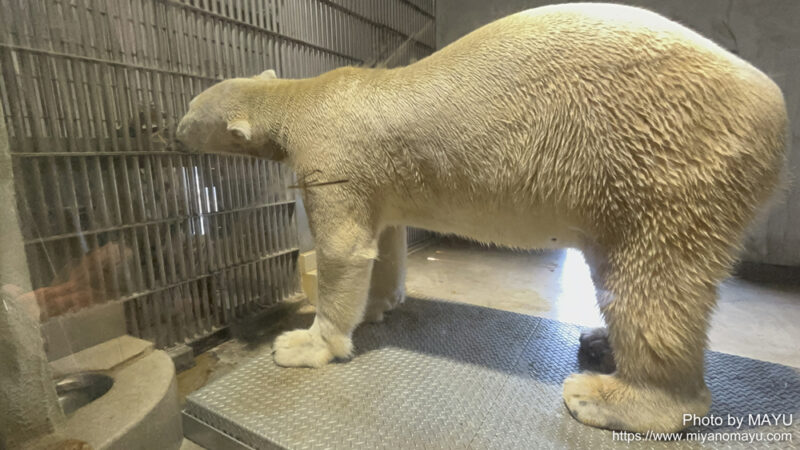 お昼前には、屋内で体重測定。日々の日課のようで、すんなりと体重計に乗って、しばらくオリーブオイルを舐め続けていました。油大好き♪ホッキョクグマ。