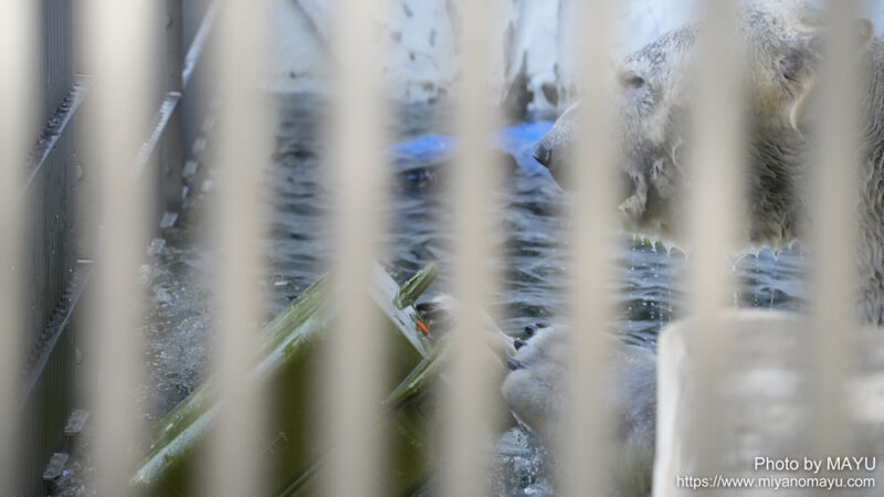 オリーブオイルでテンションが上がったのか(笑)、サブ放飼場の方のプールで激しく遊んでいました。ここのサブ放飼場は檻の隙間が狭く、見えづらい、撮りづらいですが、楽しそうにしている雰囲気は充分伝わってきます。