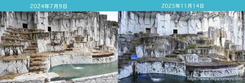 昨年(2024年)に訪問した際には、放飼場全体に乾草が敷き詰められていて、一部から発芽しているのが観られましたが、あれからさらに緑が増えたようでした。