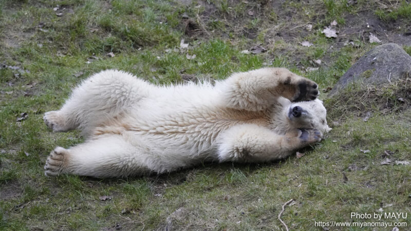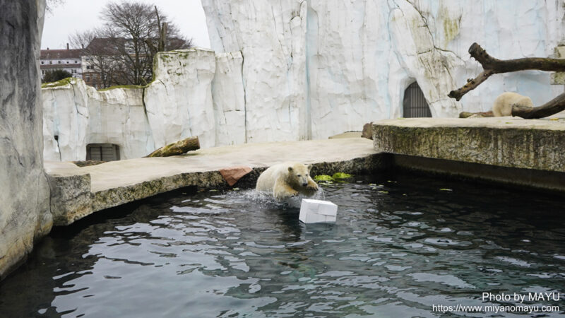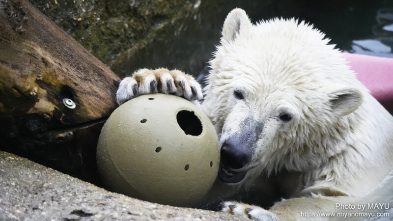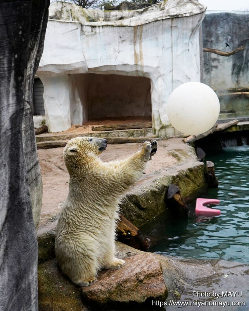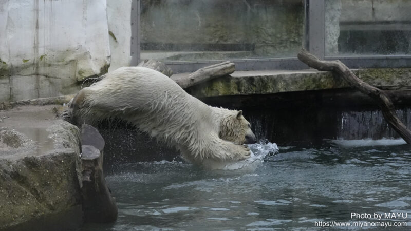 9時30分過ぎ。今朝は少しだけゆっくり入園。ホッキョクグマ舎へ到着すると、今朝はガラスの曇りもなく(すでに消えたのか?)、ミカ(オス/1歳)はプールで弾けて遊んでいました。前日と同じパターンですね。