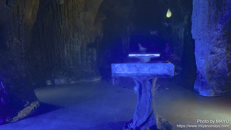 なんの写真?という感じですが、真っ暗な部屋の中に無数のコウモリが飛んでます。ボケて写っているコウモリ、まったく写らないコウモリ。真っ暗で、こんなにたくさん飛んでるのに、決してぶつかってこない!という体験が出来ます。これ、ちょっと面白いです。