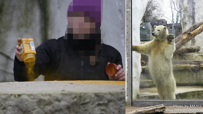 14時20分。ヌカとミカは片方の大放飼場にいて、飼育員さんは小放飼場の清掃、おもちゃ交換をしていました。最後にコンクリートの台の上に、黄色い粉を撒いていた飼育員さん。それを隣から観ているミカ。容器は「白コショウ」だったので、中身とは違うと判断。ターメリックかな?と思いましたが、結局確認することは出来ませんでした。