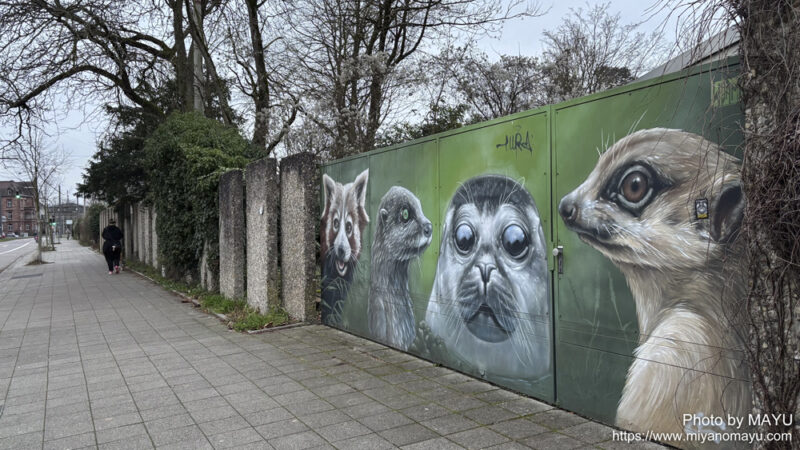 歩道の横は動物園。壁がずっと続いています。通用門のところからは、ユキヒョウやレッサーパンダが見えるところもあります。
