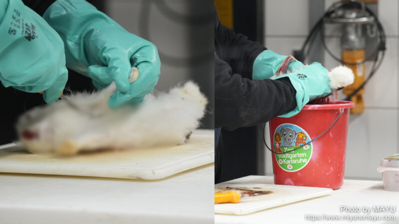 そんなタオファが熱い視線を送っていたのは、ガラス張りで公開されている調理場です。ちょうど餌の準備をしていたところに出くわしました。白い毛のついた状態のウサギを、個体に合わせて調理(カット)している様子を、幼い子どもたちもじっと観察していた、教育の現場でした。