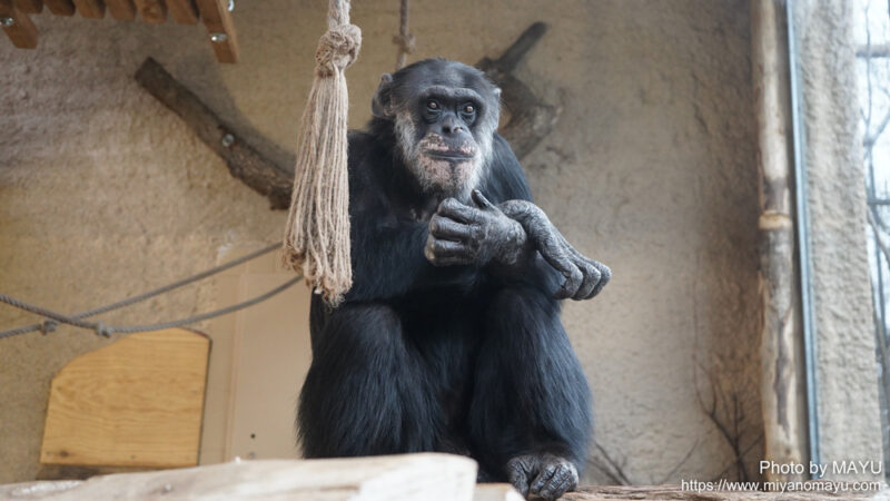 こちらはチンパンジーの長老Benny(オス/推定1967年生まれ 58歳)。ガラス越しに見た人間の幼い子に、そっと手を近づけるなど、とても穏やかそうなタイプ。幼いベニーがカールスルーエ動物園に来園した頃は、園長夫妻から子どものように愛されたとか。動物園歴55年というベテラン個体。