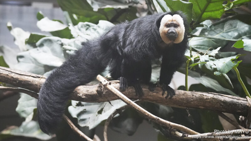 シロガオサキのオス。カールスルーエ動物園では、放鳥されている館内で放し飼い状態でした。ワオキツネザルやリスザルなどはよく体験しますが、シロガオサキを間近で見るのは初めて。ふれあうことはないですが、近すぎるとちょっと緊張感。