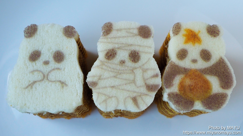 パンダバウムの種類は続々と登場し増えていますね。今回は秋の栗ぬきパンダバウムと、ハロウィンに向けたおばけパンダバウムとミイラパンダバウムです。空港などのお土産売り場でも、よく見かけるようになりました。ハロウィン540円(税込)と栗ぬき594円(税込)、いつも価格の差はどうしてかな?と思います。