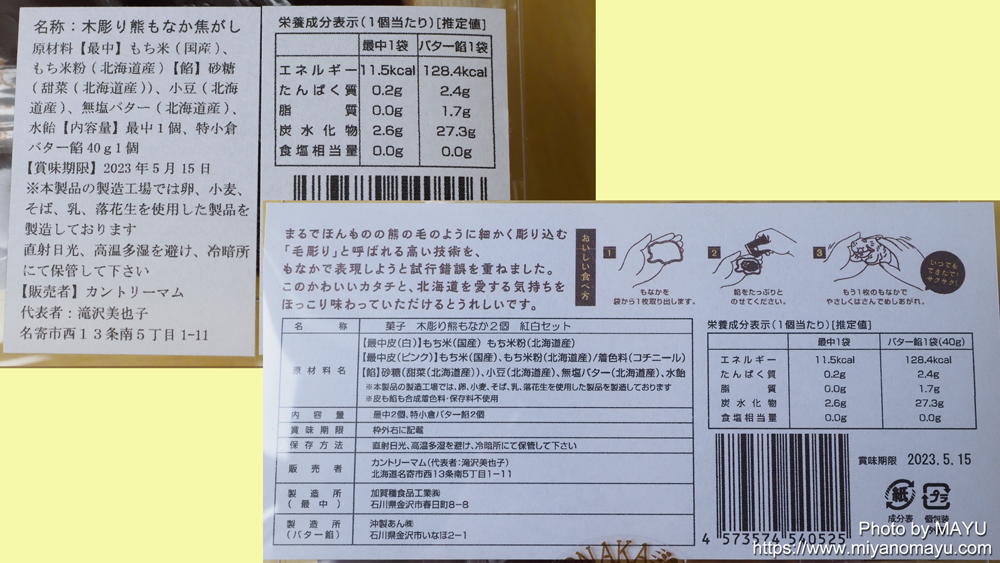 左は木彫り熊もなかが2個入った 紅白セット。右が木彫り熊もなか「焦がし」です。