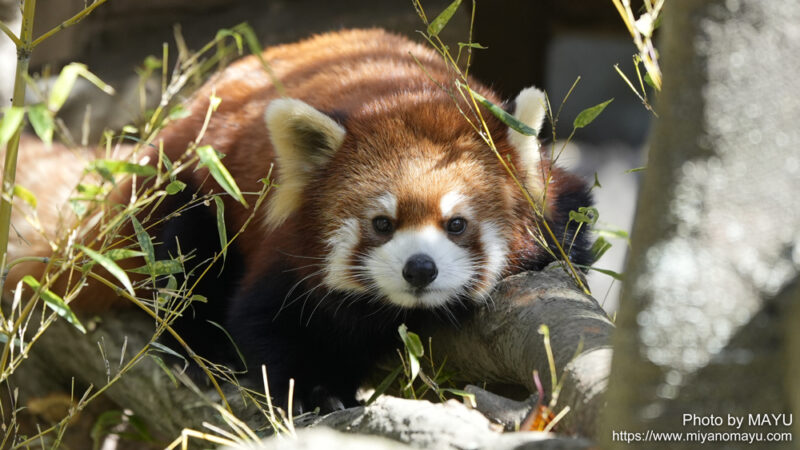 2020年7月20日多摩動物公園で生まれて、2023年11月27日ソウル動物園に移動した、リアン(メス/5歳)。広い放飼場で1頭で過ごしていました。飼育員さんが竹やおもちゃを持って登場し設置すると、少し動きを見せましたが、この時は比較的ゆったり木の上にいました。
