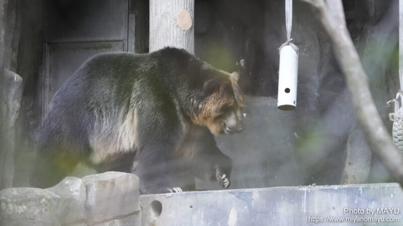 オスのコマは2010年に逸脱した武勇伝を持つ個体で、9日後に近隣の山「清渓山」で捕獲された経験があります。そんな脱走事件があったとは思えないくらい、おとなしそうにこちらを覗いていました。若かりし頃の思い出でしょうか。