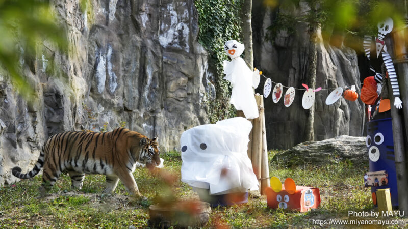 10月31日はハロウィンだったということで、シベリア(アムール)トラ舎にはハロウィンの飾り付けがたくさん設置されていました。朝と昼、個体交代をするタイミングで設置されていたようです。