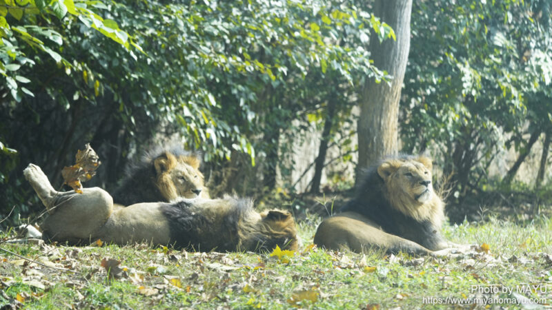 アフリカエリアでは、広大な放飼場にオスライオン3頭が近くで固まって休んでいました。