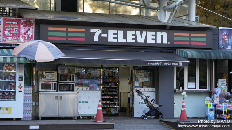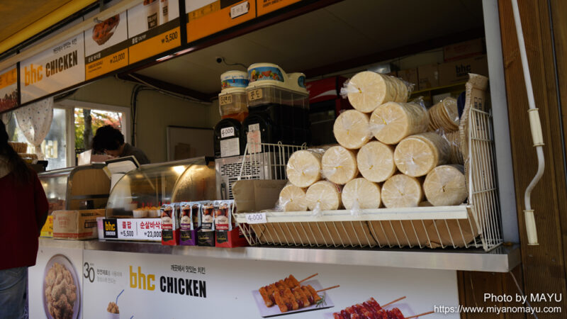 動物園内には各所に売店があり、右側の丸い薄型せんべいの束がたくさん売られていました。(3500~4000ウォン) 観光地では定番なのでしょうか?かなり気になったので、動物園では食べず、スーパーで買って食べてみました。ほんのり甘みのある大きなせんべいで、例えるならポン菓子を丸く広げたような感じでした。