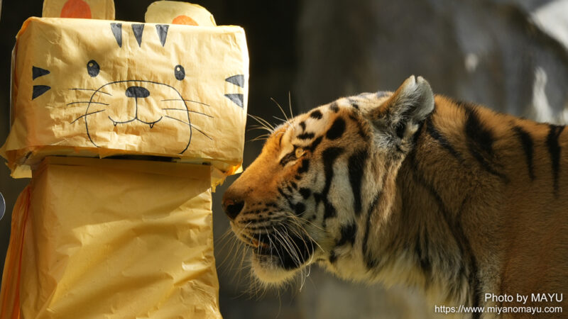 放飼場に登場したらすぐに飛びかかると思いきや、遠くから警戒しながら、ゆっくりゆっくり距離を縮めていくという、アムールトラならではのアプローチでした。午前と午後で個体が変わるので、個体の性格にも依ることが見られました。