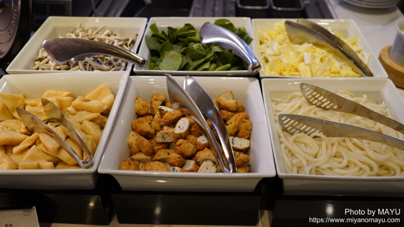 うどんの麺、野菜類、油揚げ、がんもどき、お好みで器に取りシェフにお願いすると、サッと湯がいてくれて、出汁つゆを入れてくれます。