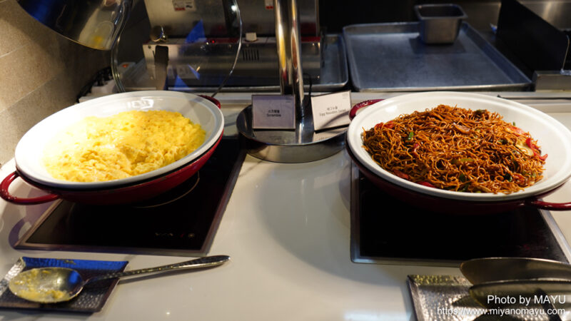 スクランブルエッグ、辛めの細麺焼きそば。