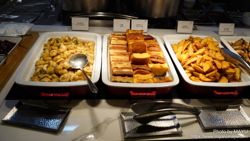 バナナのコンポート、ワッフル、フレンチトースト、フライドポテト。