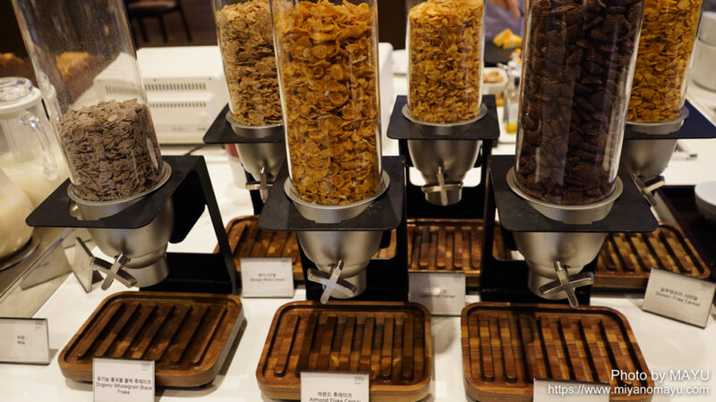 コーンフレーク各種、ヨーグルトなど。
