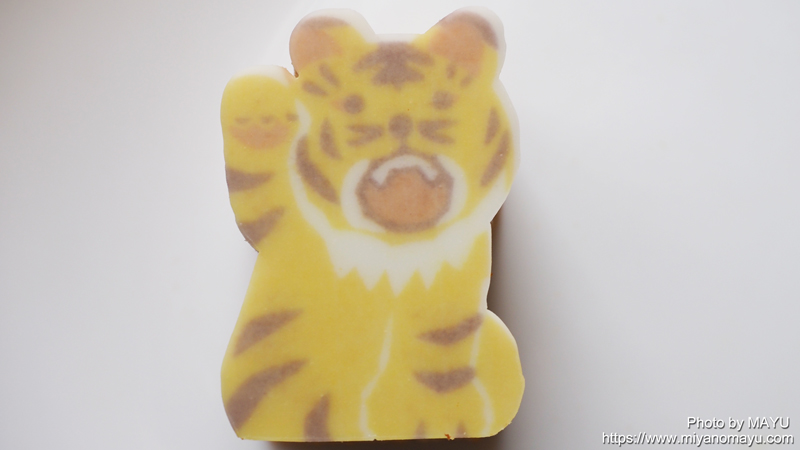 箱の中に四角いバウムクーヘンが入っています。表面のフォンダンには干支の寅が描かれています。