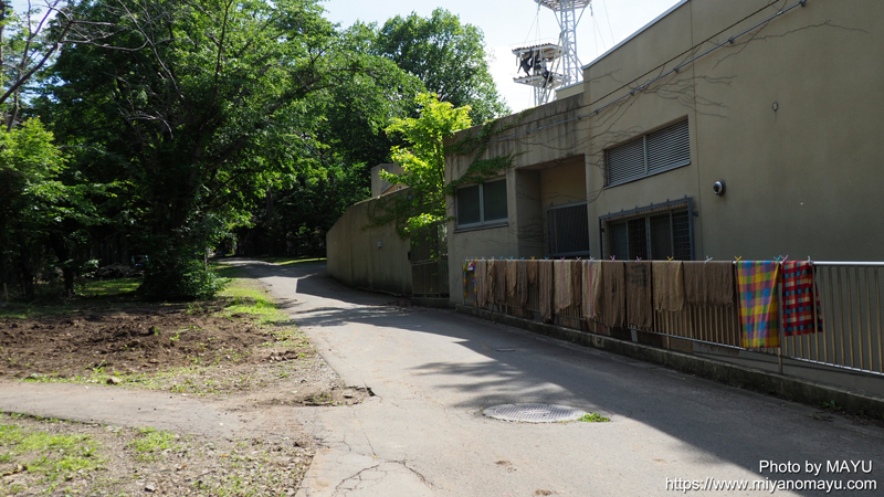 ゾウ舎からは、チンパンジー館の裏手を通っていきます。チンパンジーたちが使う麻袋や布が干してあります。