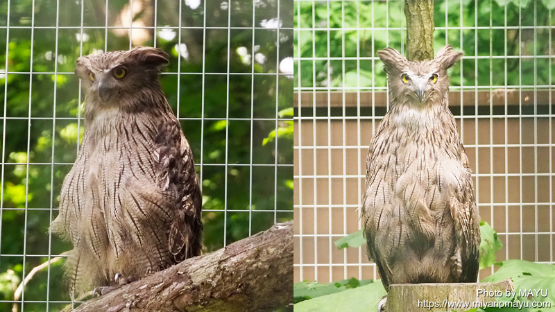 前ページにも登場したシマフクロウのポッケが生まれたのは、この野外復帰施設ですが、今年もヒナが2羽孵っており、そのヒナを観たかったのですが、結果2羽とも巣箱の中に隠れてしまい、姿を見ることは出来ず、お父さんのクック(左)とお母さんのレイン(右)の姿だけを観てきました。後で担当さんに伺ったところ、最近はヒナの警戒心が強くなってきたそうで、ガイド前には出ていたそうですが、複数人の接近を察したのか、隠れてしまったよう。もう少し成長したら大丈夫かも?ということでした。また折を見て、野生復帰ゾーンのガイドなどに参加してみようと思います。