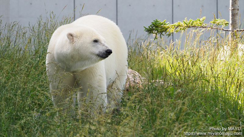 野生復帰施設を後にし、そのまま裏手からホッキョクグマ館へ向かうと、ちょうどリラが午後の給餌を屋外でもらっている時間でした。