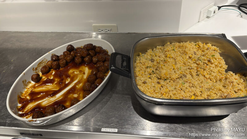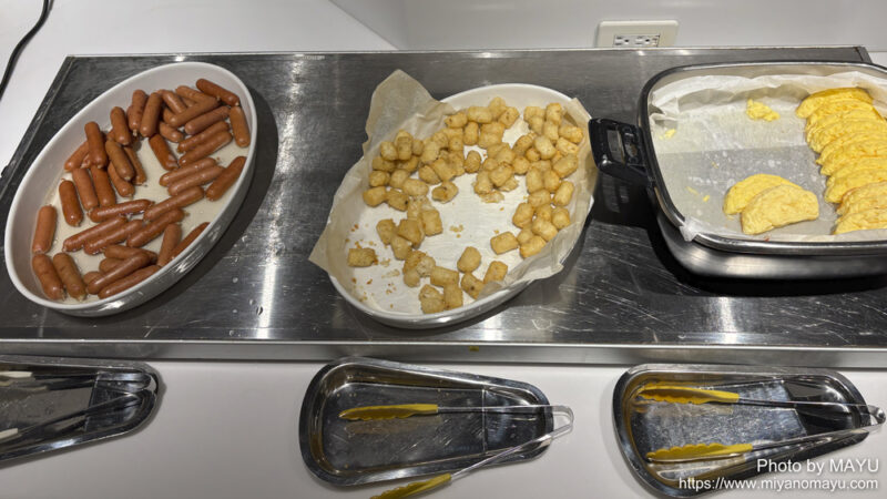 ホテルの朝食のようなメニューも並んでいます。ソーセージ、ハッシュドポテト、オムレツ。