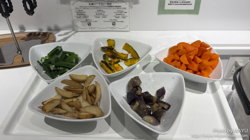 札幌スープカレーも味わえます。オクラ、かぼちゃ、ニンジン、ポテト、揚げナスを好きに取り合わせて器に入れ、隣のカレースープをかける。