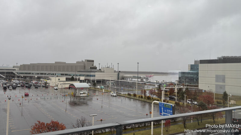 札幌は朝から土砂降りの雨でしたが、千歳も同じく雨。今日は悪天候のため出発時刻が遅れることが、朝4時の段階で発表されていたので、予定よりも少しゆっくりめに家を出発。