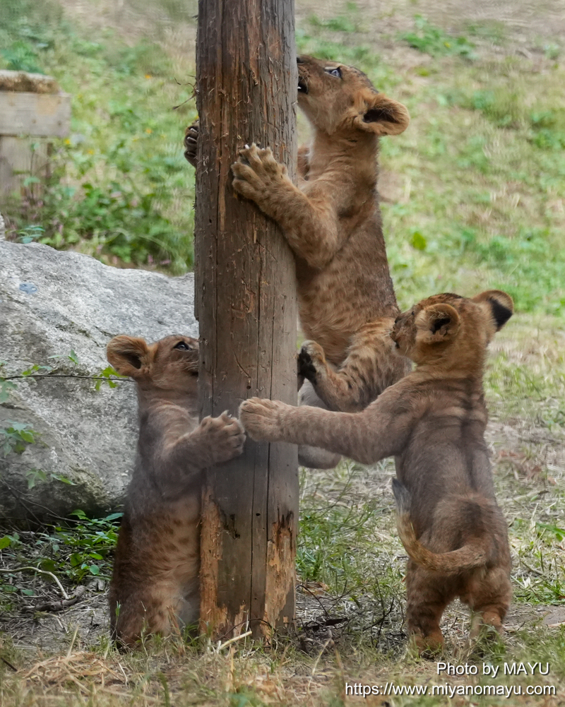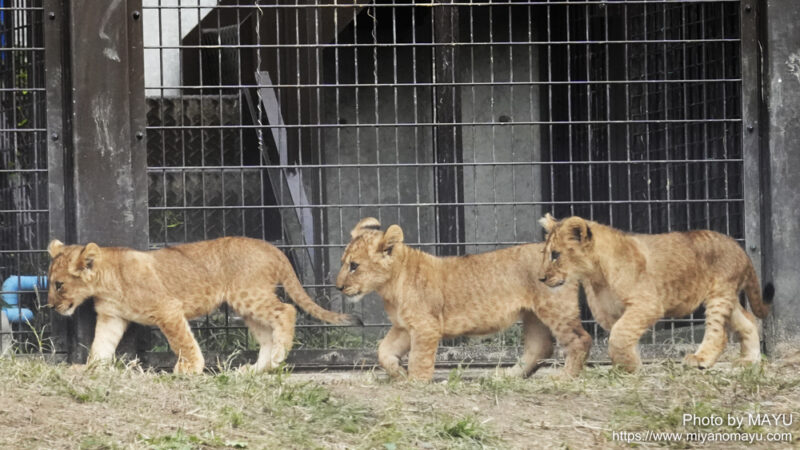 子どもたちは生後2ヶ月半過ぎ。両親に比べてとても小さいですが、四肢のがっちり感はさすがライオン。