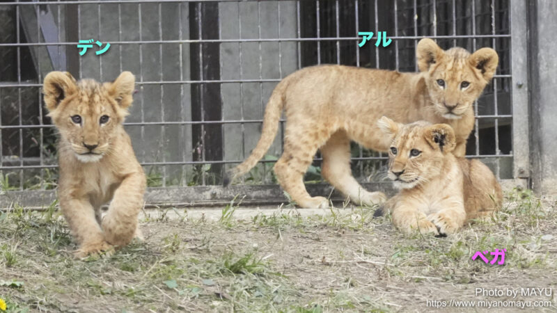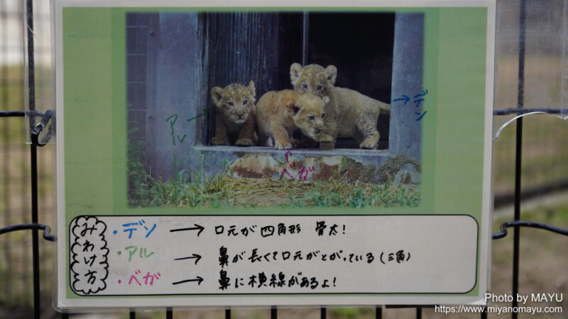 展示場前には、子ライオン3頭の見分け方が掲示されていました。
