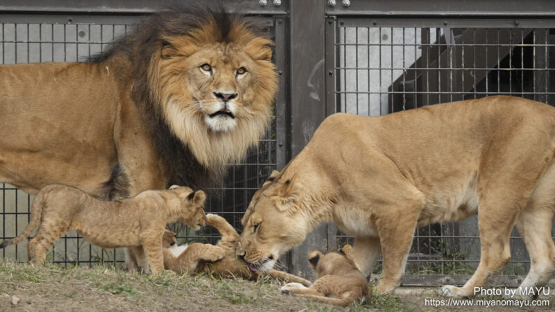 ライオン夫婦、アース(オス/7歳)とシルク(メス/8歳)の間に2025年8月17日に3頭(オス2・メス1)の赤ちゃんが誕生し、10月21日からはアースも加わった親子5頭展示が展開されています。(日曜日だけは父別居)