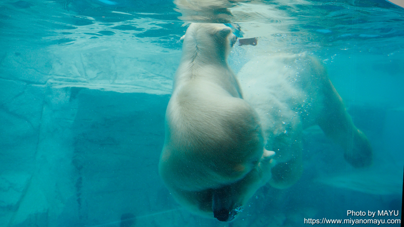 ホッキョクグマ親子の豪太(オス/17歳)、ユキ(メス/21歳)、フブキ(オス/4ヶ月)に会うために出かけた男鹿水族館GAO(秋田)。他の園館でも展示の流れは似ているなあと感じますが、男鹿水族館GAOでも、開園時間に合わせて、清掃、軽く給餌、おもちゃの交換などが行われて、朝の展示がスタートしていました。この日、ユキとフブキの展示場に用意されたおもちゃの中に、小さい赤い浮き球がありました。