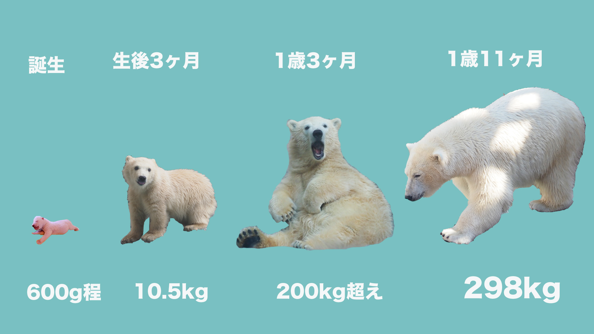 生まれて間もない頃の体重は、600g程度というホッキョクグマ。フブキは生後3か月時の体重測定では10.5kg。2022年3月時で200kg超え。12月2日時で298kgだったそうです。完全にリラを超えていて、さすがオスだなあと思います。