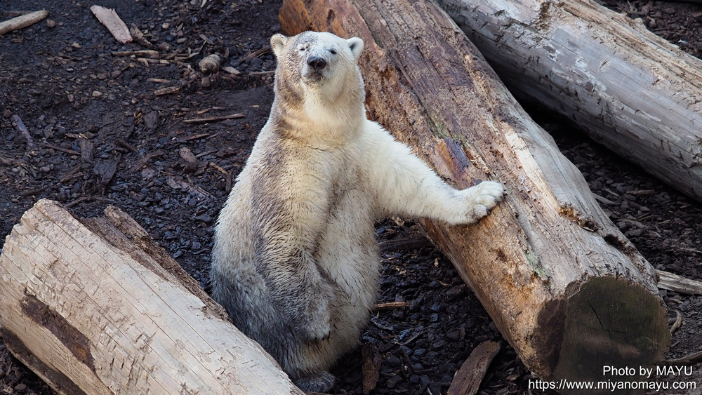 水からあがると、すぐにウッドチップエリアでスリスリするので、白いクマの時間は限定的。秋田杉とモミの大木が置かれていましたが、怪力で少しずつ移動させていました。