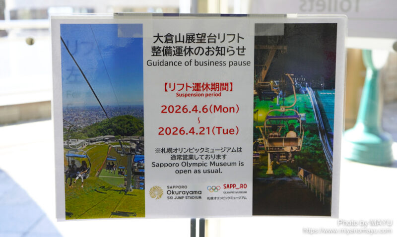 運休期間は2026年4月6日(月)~4月21日(火)までです。山の斜面を自力で登るコースもあるのですが、現在開通されているかどうかは確認していません。今回は展望台まで登らずに下山しました。