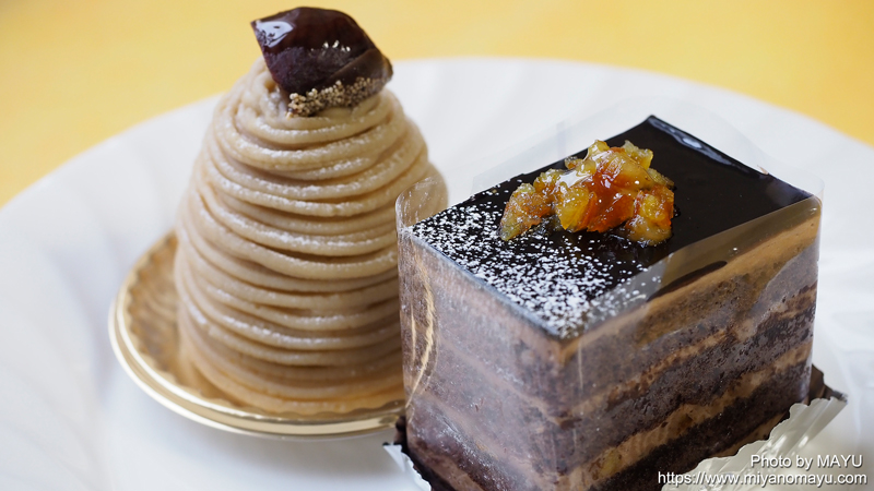 パティスリーカカオ10gの、和栗のモンブラン(左)とショコラオランジュ(右)をいただきました。