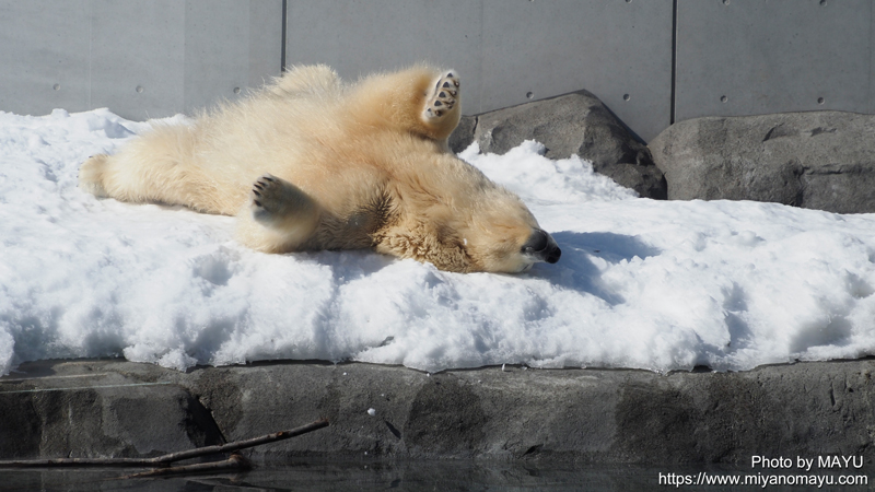 こちらはデナリ。雪の窪みにハマって昼寝中でした。今日は膝の部分が汚れていましたね。ふと、キャンディの姿を思い出しました。冬は体をよく汚していて、窪みにすっぽりハマっていたものです。