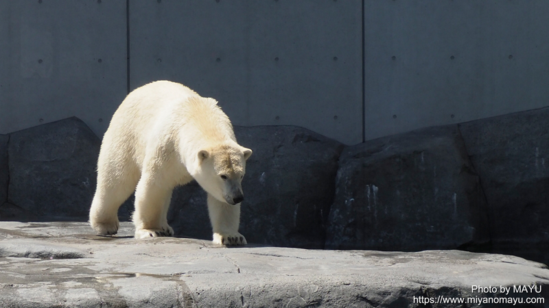 アザラシの動きを見ながら、ガラス際をトンネルの形に沿って往復するのも、水浴時のルーティン。気分が乗ってくると、アザラシの動きに合わせて、突撃することもあります。