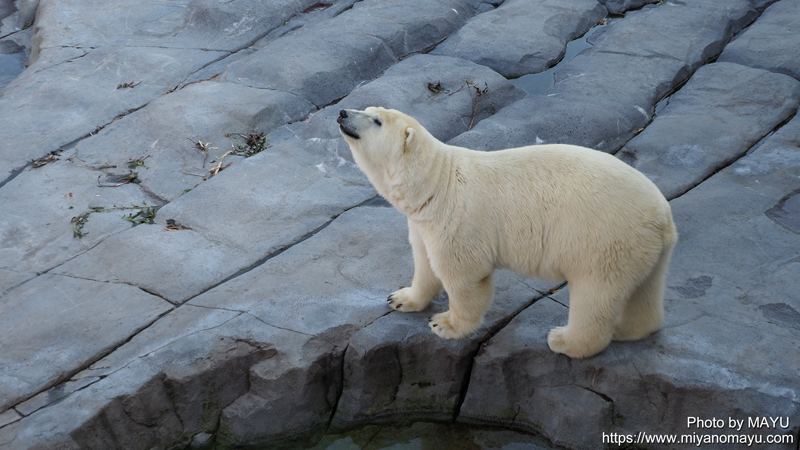 見えないけれど、ニオイを察知しているリラ。水面に映るリラもなかなかカッコいい。飼育員さんがすぐ近くにいる事はチェック出来たのではないでしょうか。