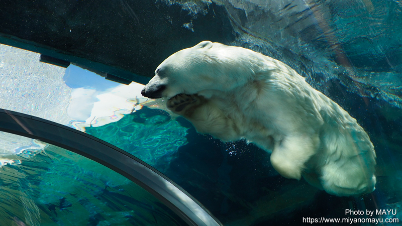 プラスチックが野生動物たちの脅威になっている内容のポスターも壁に張られています。またこのタイミングで、今までホッキョクグマ館(メイン展示場)では与えられてこなかった人工遊具を、今後は一部利用する旨が発表されました。展示内容とは矛盾するかもしれませんが、限られた空間で過ごす動物へのエンリッチメントのひとつとして対応されています。