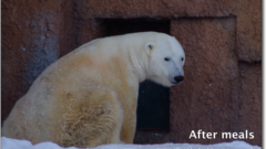 お昼にホッキョクグマ館にやってくると、ちょうどリラがプールに入るところでした。プールの中には、牛骨が2種類沈んでおり、それを持ちながら泳いだり、遊んだり、水中トンネルの上で休んだりして楽しんでいました。