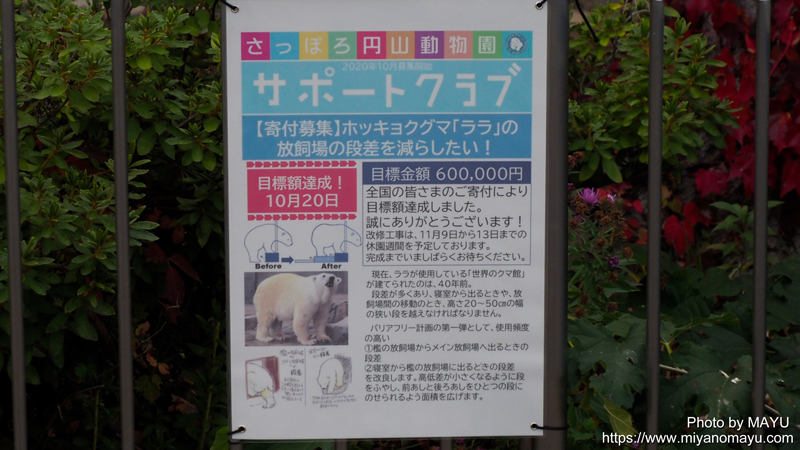 ララの放飼場の段差を減らすための、寄付金60万円が集まったことのお知らせが掲示されました。改修工事は早速11月9日〜13日(休園期間中)に行われるとのこと。