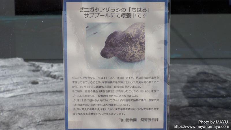 10月15日に検査が行われた、ゼニガタアザラシのちはるの容態についてが貼られていました。