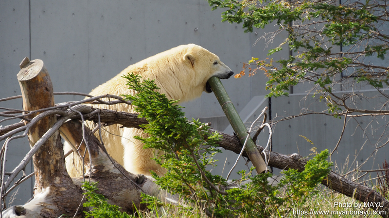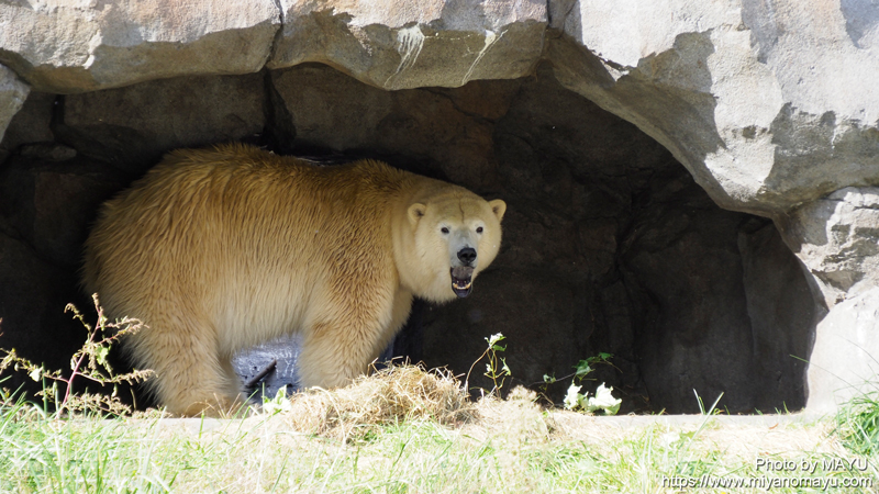 今朝、ホッキョクグマ館横にやってきていたのは大型ゴミ収集車。リラが苦手とする車両です。おそらく大きな破壊音が落ち着かないのかなと想像します。前回はかなりパニクっていましたが、経験を積んだおかげで、少し慣れてきたようで、洞窟の中でやり過ごしていました。