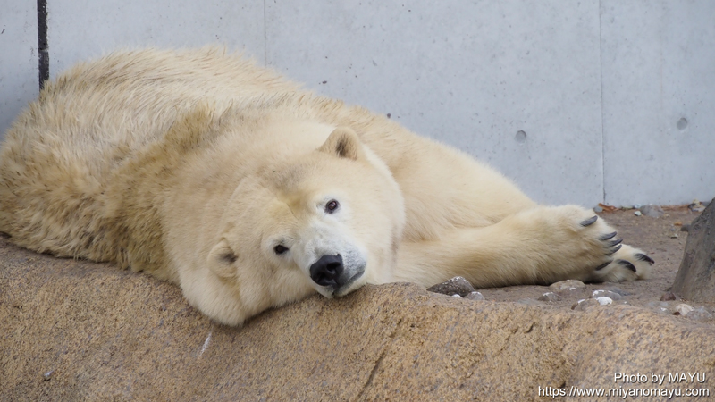 デナリは冬に向けて、体が大きくなってきました。毛足が長いことに加え、体に脂肪も蓄えているのだと思います。春夏のデナリスタイルとは、随分違うところも、ホッキョクグマのおもしろいところ。