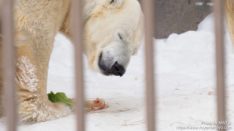 ララも檻の屋外で給餌がありました。白菜には肉のドリップがかかっていました。