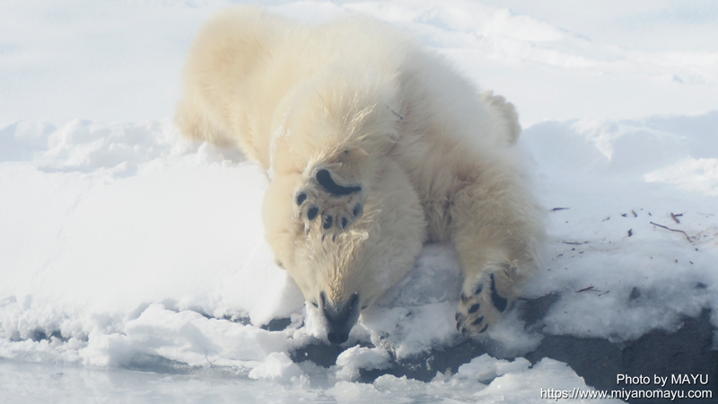氷面に対しては、なぜか仰向けになって攻めようとする行動を見せるリラ。そういえば、雪のトンネルを掘ったりする時も、仰向けになったりしますが、目線を変えるせいかな?とも思えます。車の下に潜り込む感じのね・・・