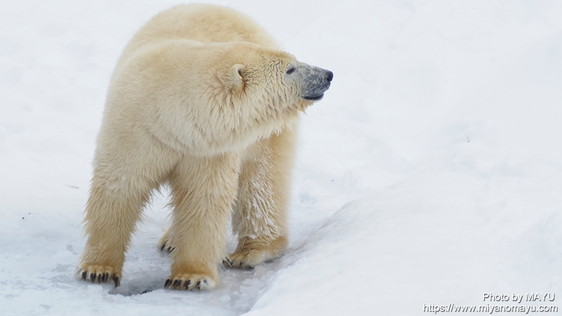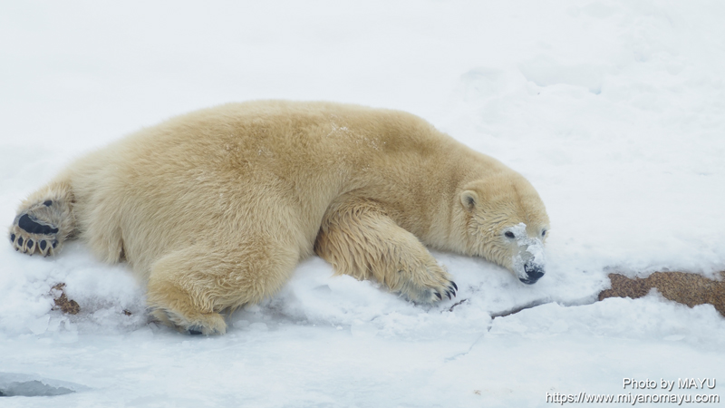 昨日、飼育員さんが少し減らしていた氷ですが、今日までに再び氷面が増えていました。明日の休園日は、少し気温が高いこともあり、氷を割って減らす予定だそうです。リラは閉園時に屋内(サブ)に収容されていました。